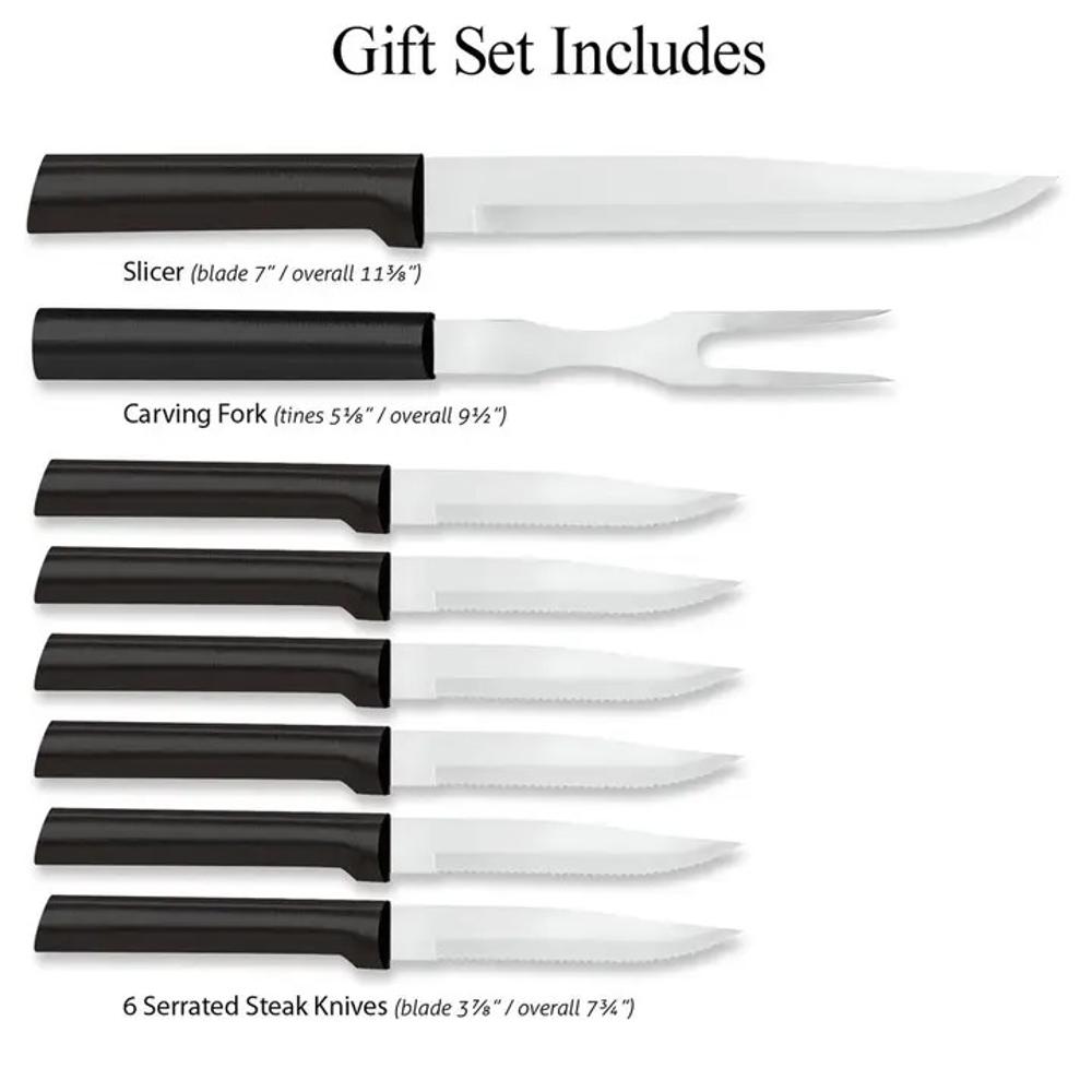 - This set includes six Serrated Steak Knives, a Slicer, and a Carving Fork.
