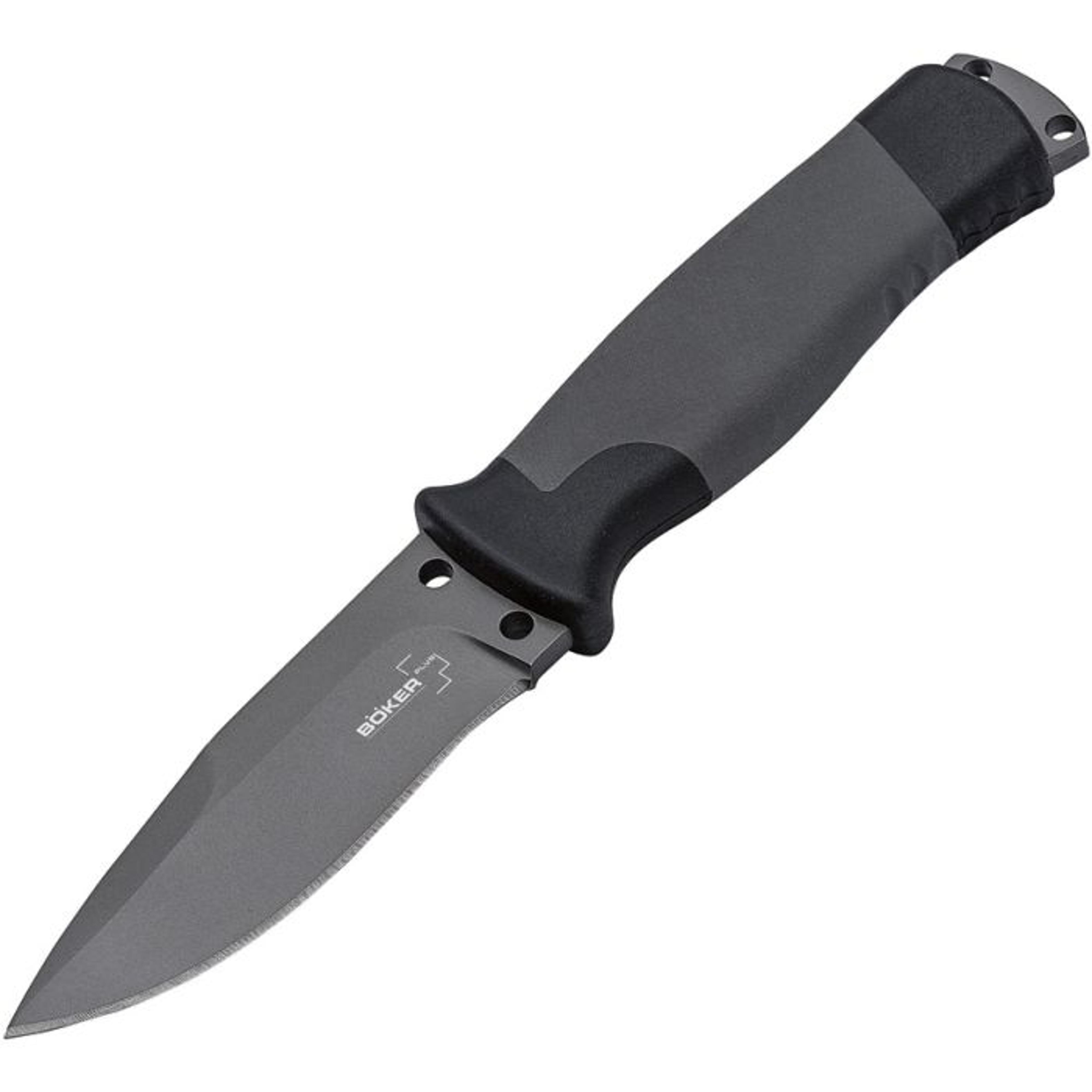 Compact, but stout, and one hundred percent tuned for utility - this is how the Boker Plus Outdoorsman presents itself. The full tang and thick blade provide maximum durability, while the protruding pommel is shaped into a hammer surface. The directly overmolded CFC handle has a very large grip zone made from pleasantly feeling TPR, therefore providing secure and pleasant handling even in wet or cold conditions. The blade is made from 12C27 and features a titanium finish for better corrosion protection. The bore in the tang not only supports attaching a lanyard, but also allows simple fastening to a stick to be used as a makeshift harpoon. A compact everyday companion for any outdoor situation or hunting. Shipped with cordura sheath.