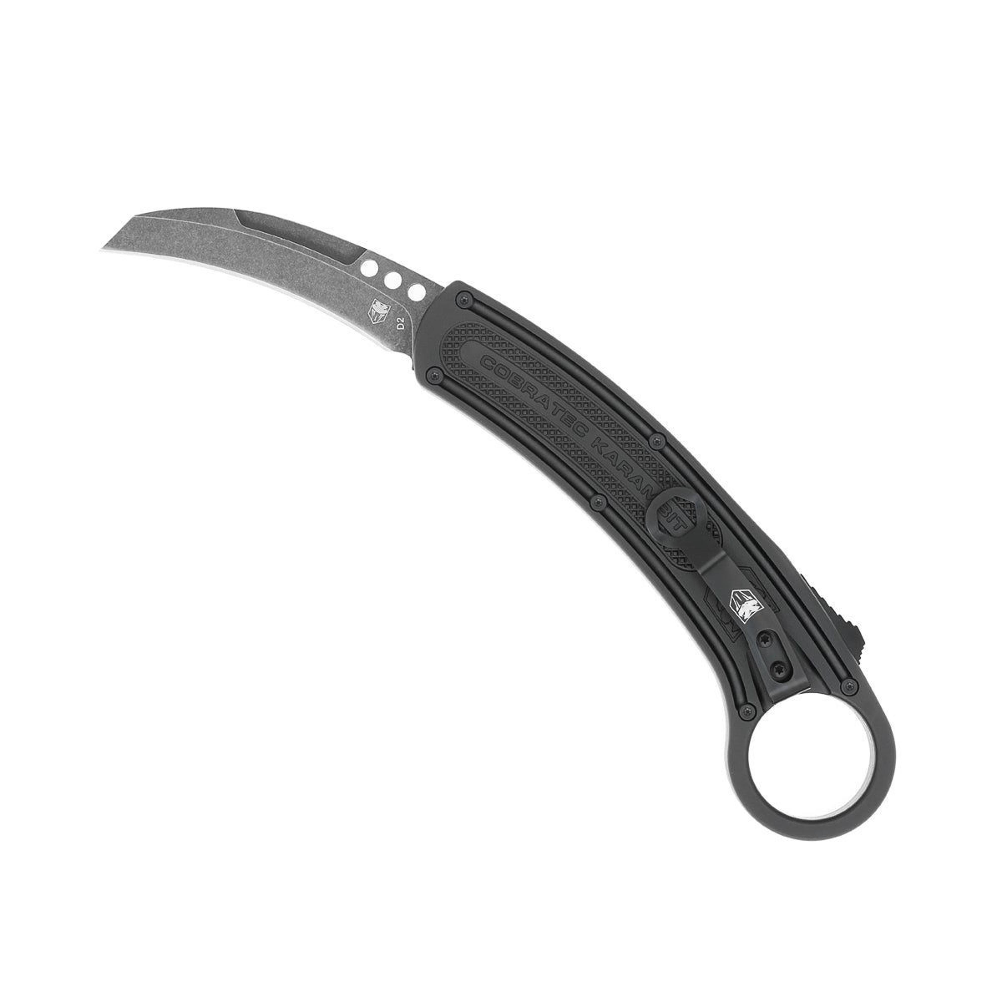 Cobratech Knives Auto Karambit RH 2.75" Stonewash D2 Blade, Black Aluminum Handle