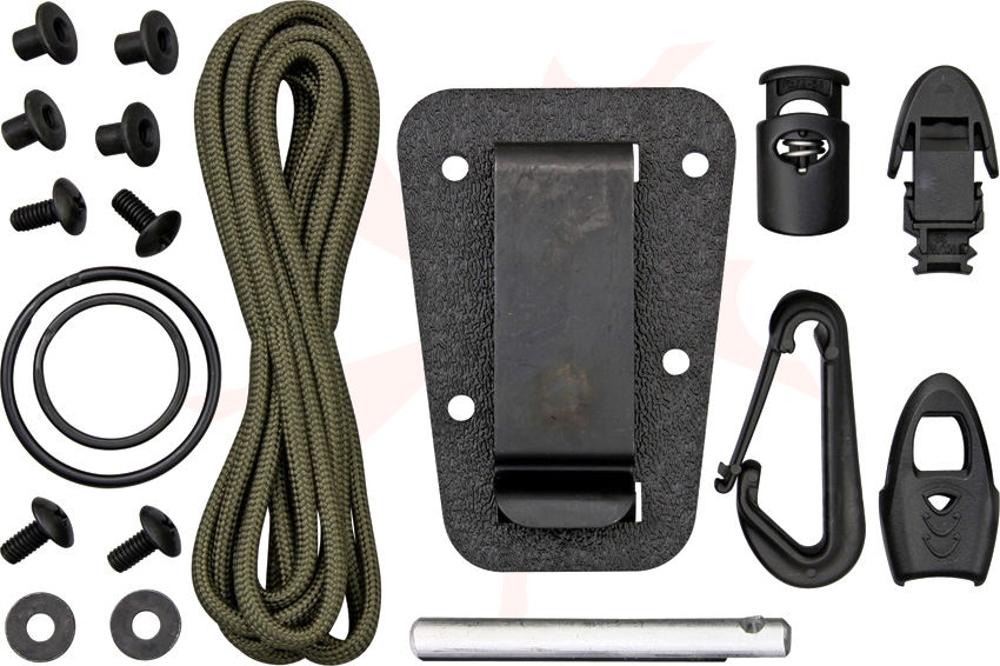 6.75" overall. 2.63" desert tan powder coated 1095HC steel blade. Desert tan canvas micarta handle. Full tang. Lanyard hole. Kit includes paracord, split rings, ferro fire starting rod, whistle, snap hook, and cord lock. Black molded plastic sheath with clip plate attachment.